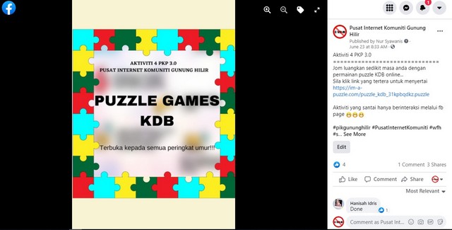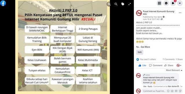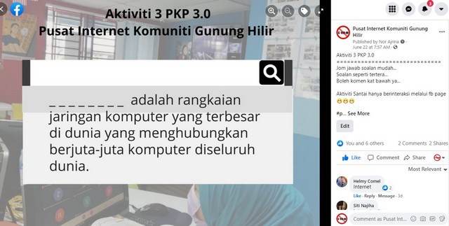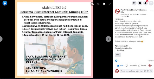 Sepanjang PKP 3.0, staf Pusat Internet Komuniti Gunung Hilir telah mengatur beberapa aktiviti melalui media sosial iaitu facebook page mengenai kuiz, puzzle KDB dan teka silang kata KDB melibatkan penyertaan peserta ahli PIK. Mereka juga turut terlibat membuat rekabentuk grafik melalui sekeping gambar mengikut tema dan nukilan peribadi berkaitan Pusat Internet Komuniti yang kemudiannya di paparkan di facebook page.