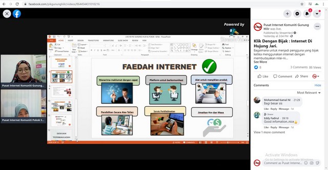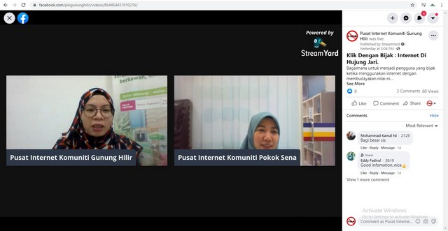 22 Februari 2021 | Aktiviti TerkiniPusat Internet Komuniti Gunung Hilir dengan kerjasama Pusat Internet Komuniti Pokok Sena telah membuat taklimat Klik Dengan Bijak (KDB) secara atas talian melalui streamyard di facebook page. Penerangan selama 40 minit tentang apa itu Klik Dengan Bijak (KDB), dan huraian tentang kebaikan dan keburukan internet telah dibentangkan melalui facebook page.