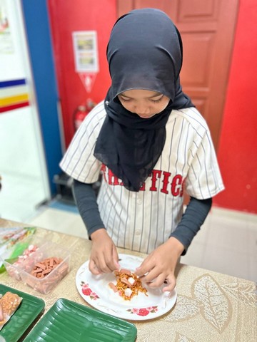 Pelajar diberi taklimat tatacara penyediaan makanan dengan bahan-bahan yang tersedia bagi menambah kemahiran mereka “soft skill” dan kreativiti dalam asas masakan. Bahan yang diperlukan adalah mee segera, “paper rice”, sosej dan juga isi ketam. Pelajar kemudian dikehendaki untuk menggulung dan menghias mengikut kreativiti sebelum menjamu selera. Mereka sangat seronok menyertai kelas masakan kerana dapat bersama-sama rakan dan menjalinkan hubungan erat antara satu sama lain.
