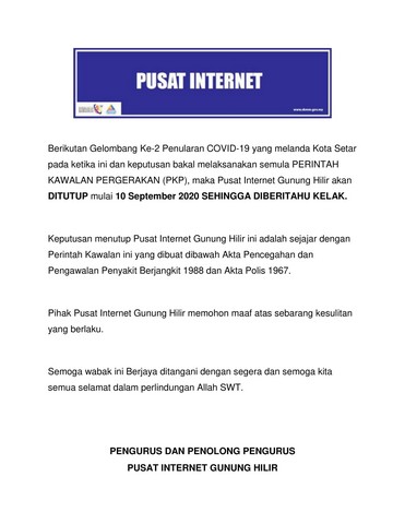 Pusat Internet akan di tutup sementara waktu di sebabkan oleh gelombang kedua wabak Covid 19. Keputusan ini adalah sejajar dengan Perintah Kawalan di bawah Akta Pencegahan dan Kawalan Penyakit Berjangkit 1988 dan Akta Polis 1967. Tarikh pembukaan semula Pusat Internet akan di maklumkan kelak. Bersama kita membendung wabak Covid 19.
